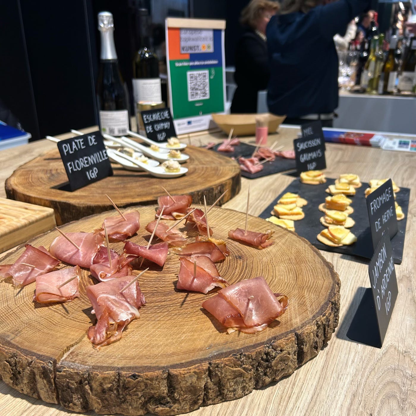 Les produits IGP et AOP Wallons bénéficiaient d’un bel emplacement dans la Chef’s Place, avec une mise en valeur particulièrement soignée. Il y avait bien sûr des dégustations simples des produits en tranches, mais aussi plusieurs associations culinaires préparées pour l’occasion. Par exemple, je savais déjà que le Fromage de Herve se marie parfaitement avec du miel. Cependant, j’ai eu l’occasion de découvrir la combinaison Escavèche de Chimay et Plate de Florenville qui fonctionne à merveille.