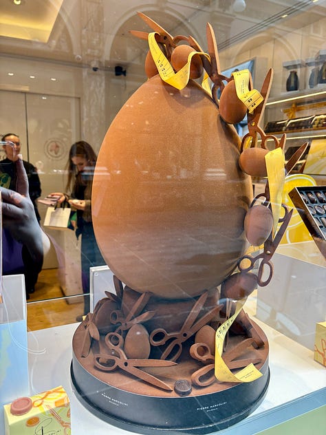 Marcolini, plus contemporain, artistique et design, opte pour le thème de la « haute couture de Pâques ». L’interprétation de l’œuf en pièce de mode est superbe et rafraîchissante. Petit bémol : le concept est moins bien décliné dans les autres points de vente.