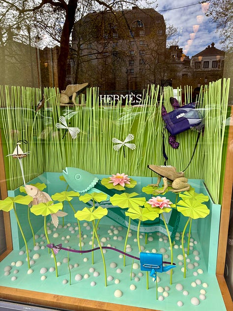 Dans le haut de gamme, mention spéciale à Hermès. Mais est-ce vraiment une surprise ? Leurs vitrines sont toujours d’une qualité exceptionnelle. J’ai particulièrement apprécié le thème de l’étang, où les produits se transforment en animaux. Sublime. La marque belge Kaai mérite également d’être citée pour sa campagne fraîche et épurée.